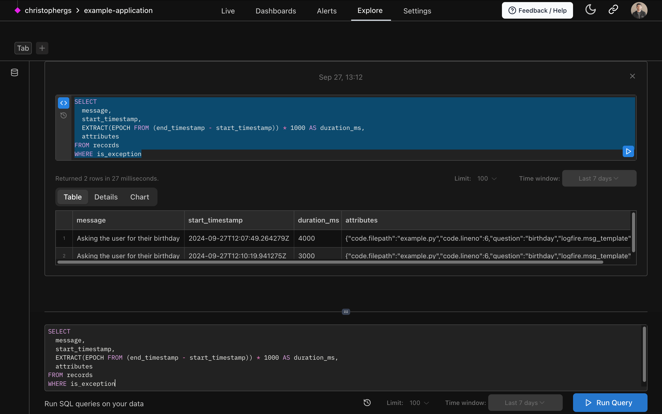 With Logfire, you can use the Explore page to run arbitrary SQL queries against your trace and metric data to analyze and investigate your system.