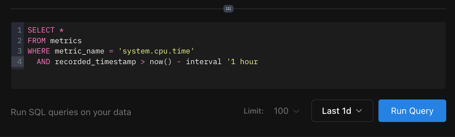 The Explore page provides a flexible interface to query your traces and metrics using standard SQL.